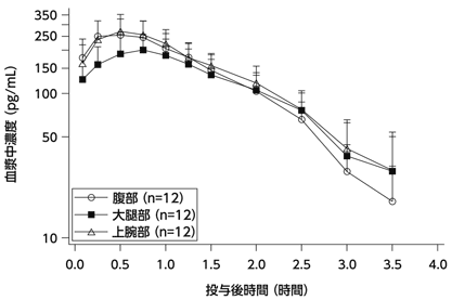 健康閉経後女性に本剤28.2μgを単回皮下投与したとき、腹部、大腿部、上腕部のいずれの投与部位でも血漿中テリパラチド酢酸塩濃度は速やかにピークに達し、また消失も速やかであった(表及び図参照)2) 。