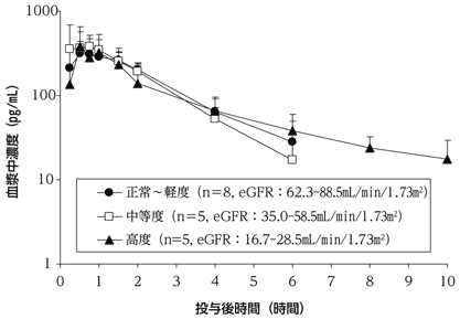 腎機能障害者にテリパラチドとして56.5μg注)を単回皮下投与したときCmax及びAUCinfは腎機能の影響を大きく受けず、T1/2は高度腎障害者で延長したが(表参照)、本剤の投与間隔を考慮すれば血漿からの消失は十分に速やかであると考えられた(図参照)8) 。したがって、腎機能の程度によって用法・用量を変更する必要はないと考えられた。なお、腎透析患者を対象とした試験は実施されていない。