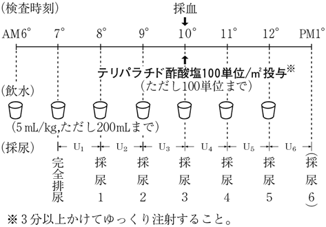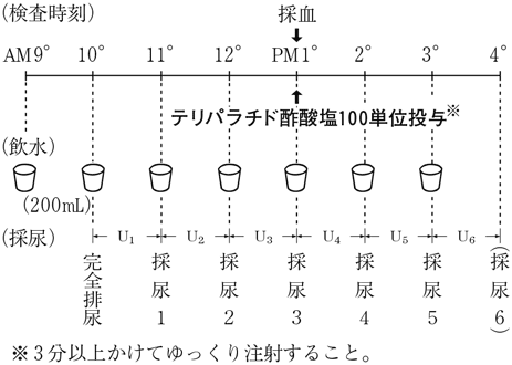 Ellsworth-Howard試験実施方法 Ⅰ.方法厚生省特定疾患ホルモン受容機構異常調査研究班の方法に準じる1)。 成人は[A]の標準法に従うのを原則とする。小児も可能ならば午後1時にPTHを投与する方法が望ましい。その際のPTH投与量や飲水は[B]の方法に準拠する。