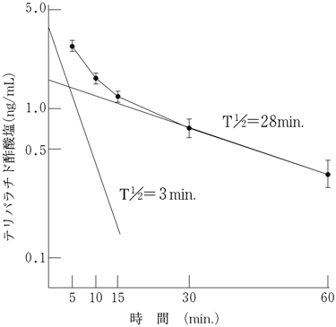 本剤20μg(67単位)を特発性及び術後性副甲状腺機能低下症の患者17例に静脈内投与した場合、投与後5分で2.63ng/mLの平均血中濃度を示し、血中半減期は3分と28分の二相性を示した2)。
