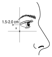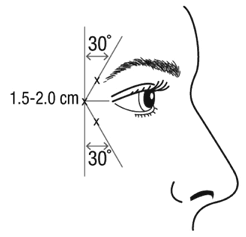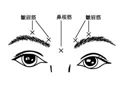通常、65歳未満の成人にはA型ボツリヌス毒素として合計10~20単位を左右の皺眉筋に各2部位(合計4部位)及び鼻根筋1部位に均等に分割して筋肉内注射する。なお、症状再発の場合には再投与することができるが、3ヵ月以内の再投与は避けること。〈注射部位〉(図1)
