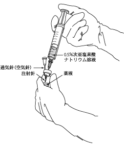 バイアルの陰圧が保たれていない場合は使用しないこと。そのバイアルに0.5%次亜塩素酸ナトリウム溶液を加えて失活させた後、密閉可能な廃棄袋又は箱に廃棄すること。