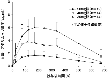 通常、成人にはアダリムマブ(遺伝子組換え)として初回に80mgを皮下注射し、以後2週に1回、40mgを皮下注射する。なお、効果不十分な場合には1回80mgまで増量できる。
