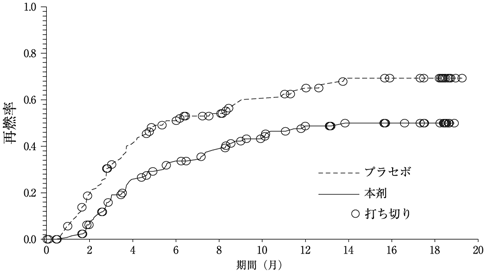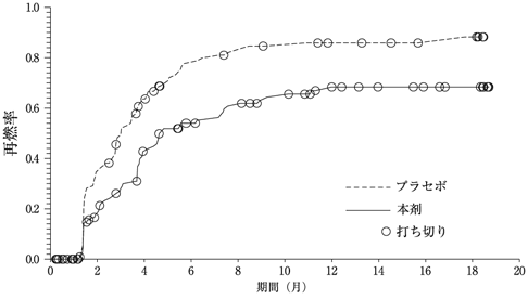 過去に経口ステロイド減量により再燃した経験のある、一定用量の経口ステロイド治療(プレドニゾロン換算10~35mg/日)により症状が安定している非活動性ぶどう膜炎患者258例(うち日本人32例)を対象として、試験開始時の経口ステロイドの用量を漸減したときの再燃までの期間を評価したプラセボ対照二重盲検比較試験の結果を以下に示す。