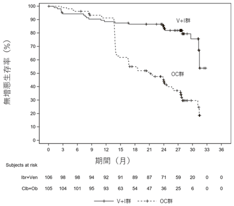 本剤を投与されたV+I群134例のうち、113例(84.3%)にベネトクラクスとの因果関係のある副作用が認められた。主な副作用は、下痢50例(37.3%)、好中球減少症43例(32.1%)、悪心27例(20.1%)、疲労22例(16.4%)、血小板減少症17例(12.7%)、貧血16例(11.9%)等であった27)。