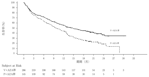 a:無作為化された433例(V+AZA群287例、P+AZA群146例)のうち、治験実施計画書の改訂前に組み入れられた2例を除く431例が有効性の解析対象とされたb:層別Cox比例ハザードモデルにより算出c:層別log-rank検定(有意水準:両側0.02)d:無作為化された228例(V+AZA群148例、P+AZA群80例)のうち、治験実施計画書の改訂前に組み入れられた2例を除く226例が有効性の解析対象とされたe:二項分布に基づく正確な信頼区間f:Cochran-Mantel-Haenszel検定(有意水準:両側0.01)
