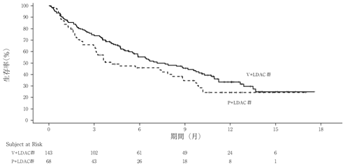 強力な寛解導入療法の適応とならない未治療の急性骨髄性白血病患者211例(日本人患者27例を含む)を対象とし、本剤及び低用量シタラビンの併用療法(V+LDAC)をプラセボ及び低用量シタラビンの併用療法(P+LDAC)と比較するランダム化二重盲検第Ⅲ相試験である。第1、2、3及び4日目にそれぞれ本剤100、200、400及び600mg又はプラセボを1日1回経口投与した後、本剤600mg又はプラセボを1日1回継続投与した。低用量シタラビンは28日を1サイクルとし、各サイクルの1~10日目に20mg/m2を1日1回皮下投与した。主要評価項目である全生存期間(OS)において、V+LDAC群はP+LDAC群に対して統計学的に有意な延長を示さなかった(データカットオフ日:2019年2月15日)。なお、治験責任医師判定の複合的完全寛解(完全寛解[CR]+血球数回復が不完全な完全寛解[CRi])率は、V+LDAC群では47.6%(68/143例)(95%信頼区間:39.1-56.1%)、P+LDAC群では13.2%(9/68例)(95%信頼区間:6.2-23.6%)であった。