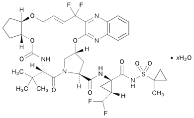 (3aR,7S,10S,12R,21E,24aR)-7-(1,1-ジメチルエチル)-N-{(1R,2R)-2-(ジフルオロメチル)-1-[(1-メチルシクロプロパン-1-スルホニル)カルバモイル]シクロプロピル}-20,20-ジフルオロ-5,8-ジオキソ-2,3,3a,5,6,7,8,11,12,20,23,24a-ドデカヒドロ-1H,10H-9,12-メタノシクロペンタ[18,19][1,10,17,3,6]トリオキサジアザシクロノナデシノ[11,12-b]キノキサリン-10-カルボキサミド 水和物