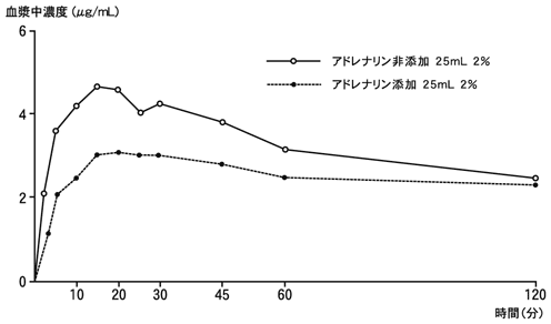 患者に2%メピバカイン液25mL(メピバカイン塩酸塩として500mg)単独あるいはアドレナリンを添加(1:200,000)して硬膜外投与したとき、単独群での血漿中濃度は、15分後に最高濃度(4.65μg/mL)を示したが、アドレナリン添加群では最高濃度の低下(36%)及び最高濃度到達時間の遅延が認められた1)(外国人データ)。