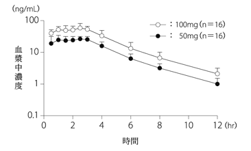 健康成人男性にスマトリプタン50mg及び100mgを単回経口投与した時の血漿中スマトリプタン濃度は下記のとおりである。血漿中濃度推移は2峰性を示した。スマトリプタンは速やかに吸収され、最初のピークは投与後1.5時間までに認められた。第2のピークは投与後2~3時間の間に認められ、消失半減期は約2時間であった。Cmax及びAUC0−∞は投与量の増加と共に増加した。また、Cmax及びAUC0−∞には個体間差が認められた。なお、健康成人男性にスマトリプタン50mg及び100mgを単回経口投与した時の薬物動態パラメータは下記のとおりであり、日本人と外国人の成績に大きな差は認められなかった(外国人データ)。