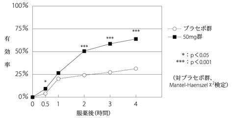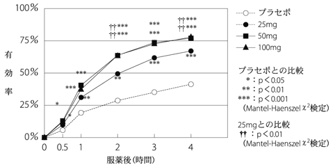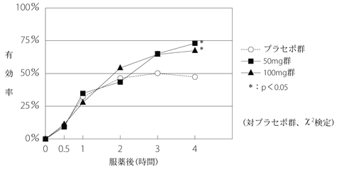 片頭痛患者を対象としたプラセボ対照、用量反応、二重盲検比較試験において、本剤50mg、100mgの服薬4時間後における有効率はそれぞれ71.4%(50/70例)及び66.7%(46/69例)であり、プラセボと比較し、2時間から3時間後より差がみられ、服薬4時間後において有意に高い有効率を示した9)。