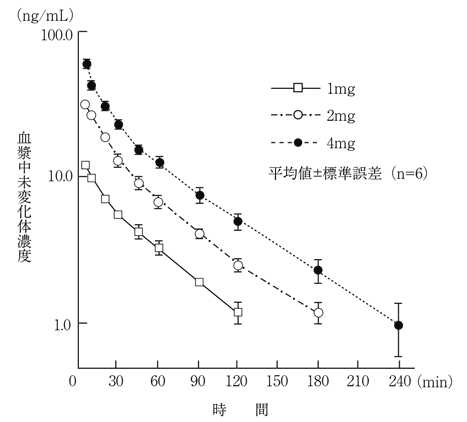 健康成人男子に1、2、4mg注)を静脈内投与したときの血漿中未変化体の消失半減期は49~52分であり、血漿中濃度曲線下面積は投与量に比例して増加し、分布容積及び血漿クリアランスは投与量にかかわらず一定であった1)。