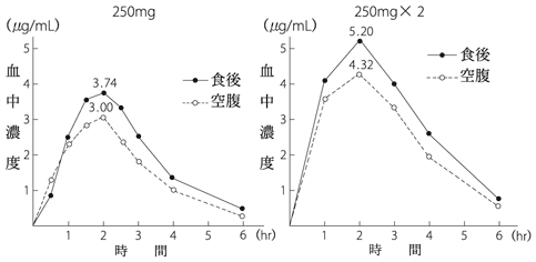 健康成人に本剤250mg(力価)又は500mg(力価)を単回経口投与した時、空腹時より食後投与の方が、吸収が良好である3),4)。