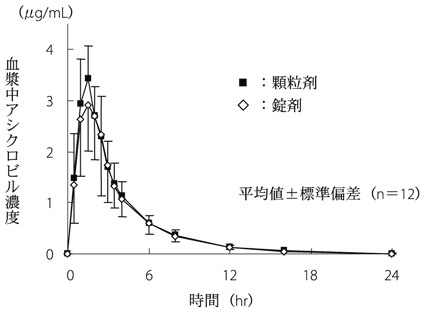 12例の健康成人にバラシクロビル500mg(顆粒剤1g又は錠剤1錠)を単回経口投与した場合、その活性代謝物である血漿中アシクロビル濃度の推移及び薬物動態パラメータは下記のとおりであった。両製剤は生物学的に同等である。
