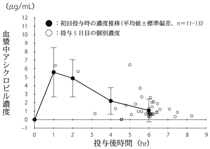 バラシクロビル500mgを1日2回(12時間毎)又は1000mg(錠剤)を1日3回(8時間毎)6日間反復経口投与した場合、数回の投与で血漿中アシクロビル濃度は定常状態に達し、トラフ濃度の平均はそれぞれ0.22~0.29μg/mL及び0.94~1.18μg/mLであり蓄積性は認められなかった5)。