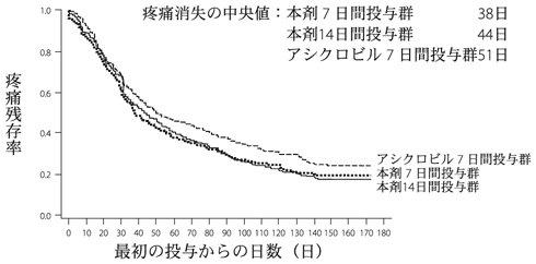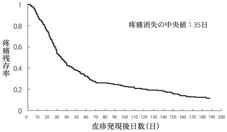 国内において実施された特定使用成績調査において、成人帯状疱疹患者に本剤を投与(平均2944mg/日×7.2日)した316例の帯状疱疹に伴う疼痛の消失推移を検討した。その結果、疼痛消失までの日数(中央値)は35日であり、PHN移行率(皮疹発現90日後の疼痛残存率)は24.7%(78/316例)であった(錠剤の成績)。