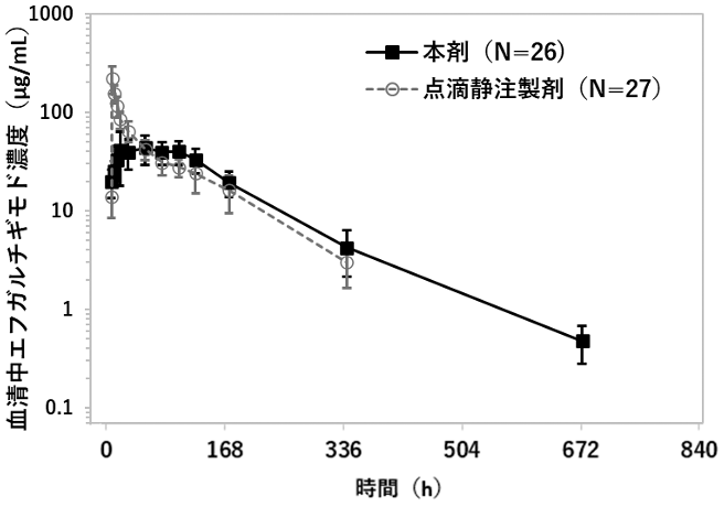 外国人健康被験者54例に本剤(エフガルチギモド アルファ(遺伝子組換え)として1,006.5mg及びボルヒアルロニダーゼ アルファ(遺伝子組換え)として12,200単位)又はエフガルチギモド アルファ(遺伝子組換え)点滴静注製剤10mg/kgを1週間間隔で計4回皮下又は静脈内投与するサイクルを1回行った。4回目の投与後の薬物動態パラメータを下表に、血清中濃度推移を下図に示す3) (外国人データ)。