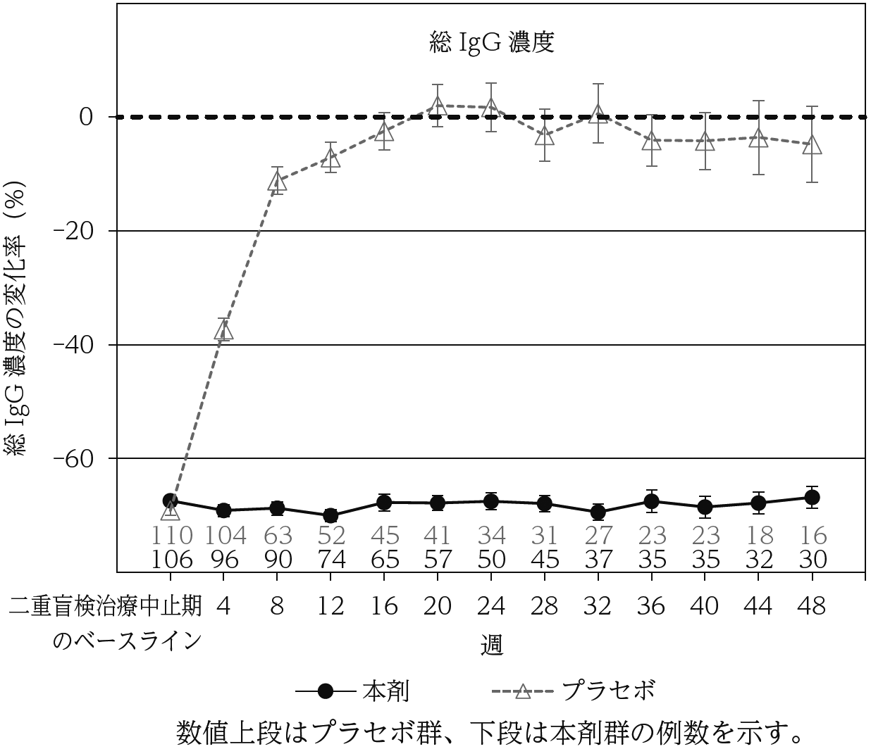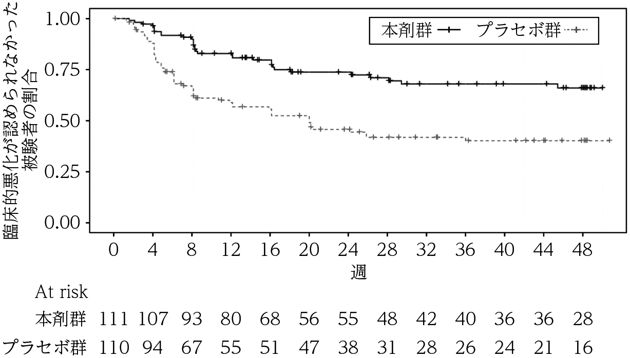 *18歳以上の疾患活動性を有する慢性炎症性脱髄性多発根神経炎患者を対象とした非盲検導入期(ステージA、最長13週間)及び二重盲検治療中止期(ステージB、最長48週間)から構成されるプラセボ対照二重盲検無作為化治療中止試験が実施された。非盲検期において、慢性炎症性脱髄性多発根神経炎患者322例(日本人患者24例を含む)を対象に、本剤(エフガルチギモド アルファ(遺伝子組換え)として1,008mg及びボルヒアルロニダーゼ アルファ(遺伝子組換え)として11,200単位注5) )を週1回皮下投与したとき、主要評価項目である非盲検期中に臨床的改善注6) が2回連続で確認された被験者の割合は、66.5%(214/322例)[95%信頼区間:61.0, 71.6]であった。なお、初めて臨床的改善が認められるまでの時間の中央値は43.0日[95%信頼区間:31.0, 51.0]であった。非盲検期間中に臨床的改善注6) が2回連続で確認された被験者を対象として、二重盲検治療中止期に移行した被験者221例(日本人患者18例を含む)に本剤(エフガルチギモド アルファ(遺伝子組換え)として1,008mg及びボルヒアルロニダーゼ アルファ(遺伝子組換え)として11,200単位注5) )又はプラセボを週1回皮下投与したとき、主要評価項目である二重盲検治療中止期のベースラインからの臨床的悪化(調整INCATスコアの1点以上の増加)注7) が最初に認められるまでの期間については以下のとおりであった。