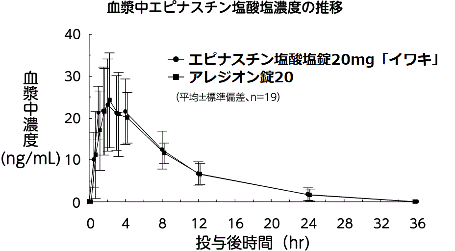エピナスチン塩酸塩錠20mg「イワキ」とアレジオン錠20を、クロスオーバー法によりそれぞれ1錠(エピナスチン塩酸塩として20mg)健康成人男子19名に絶食単回経口投与して血漿中未変化体濃度を測定し、得られた薬物動態パラメータ(AUC、Cmax)90%信頼区間法にて統計解析を行った結果、log(0.8)~log(1.25)の範囲内であり、両剤の生物学的同等性が確認された2) 。