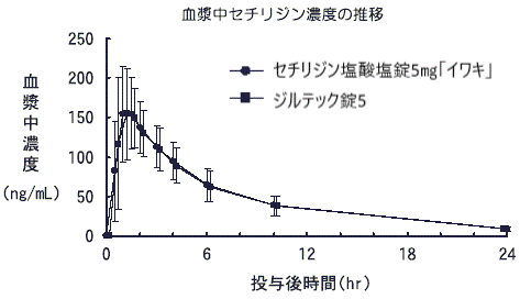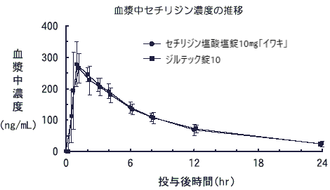 セチリジン塩酸塩錠5mg「イワキ」とジルテック錠5を、クロスオーバー法によりそれぞれ1錠(セチリジン塩酸塩として5mg)健康成人男子20名に絶食単回経口投与して血漿中未変化体濃度を測定し、得られた薬物動態パラメータ(AUC、Cmax)について90%信頼区間法にて統計解析を行った結果、log(0.8)〜log(1.25)の範囲内であり、両剤の生物学的同等性が確認された3) 。