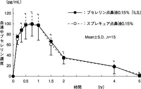 ブセレリン点鼻液0.15%「ILS」とスプレキュア点鼻液0.15%を、クロスオーバー法により左右鼻腔内に各々1噴霧ずつ(ブセレリンとして300μg)健康成人男子に絶食単回投与し、血清中未変化体濃度を測定し、得られた薬物動態パラメータ(AUC,Cmax)について、90%信頼区間法にて統計解析を行った結果、log(0.8)~log(1.25)の範囲内であり、両剤の生物学的同等性が確認された2)。