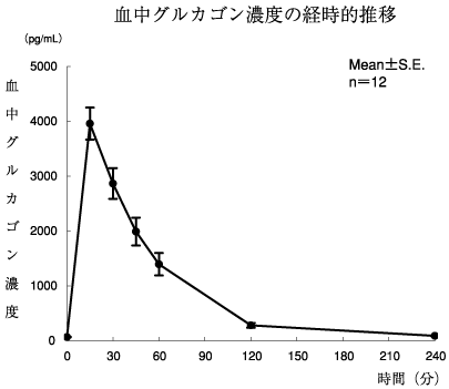 健康成人男子に本剤1USP単位を筋肉内注射した場合の血中グルカゴン濃度の推移は下図のとおりで、Cmaxは3958pg/mL、AUCは3592pg・hr/mL、Tmaxは15minであった1) 。