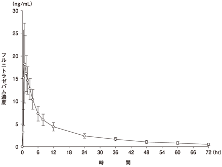 健康成人男子を対象に、フルニトラゼパム2mgを絶食下単回経口投与したときの平均血漿中濃度推移は図のとおりであった1)。