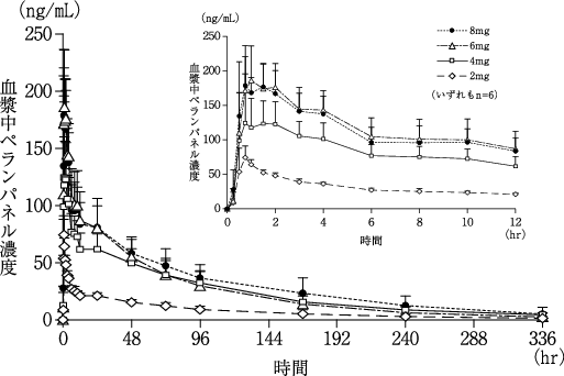 日本人健康成人にペランパネル2~8mgを絶食下単回経口投与注5)したときの血漿中濃度推移を図に示し、薬物動態パラメータを表に示した。ペランパネルは単回経口投与後速やかかつほぼ完全に吸収され、初回通過効果はほとんど受けない1),2)。
