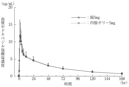 健康成人男子を対象に、アリセプト内服ゼリー5mg、錠5mgを絶食下単回経口投与したときの平均血漿中濃度推移は図のとおりであった。