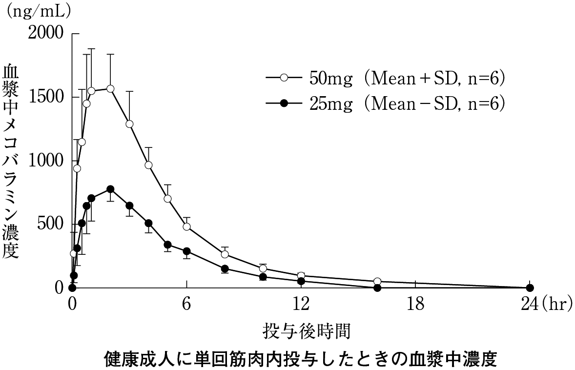 日本人健康成人男子にメコバラミン25mg注3) 及び50mgを1日1回7日間筋肉内投与したときの7日目の薬物動態パラメータは下記のとおりである2) 。