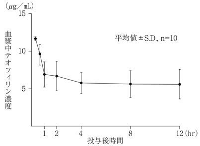 母体の血清中テオフィリン濃度が9.69±1.62μg/mL(平均値±S.E.,n=9)のとき、臍帯血の血清中テオフィリン濃度は10.21±1.71μg/mL(n=12)である2)(外国人データ)。