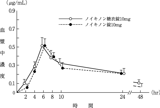 健康成人男子を対象に、クロスオーバー法により錠10mgあるいは糖衣錠10mgをそれぞれ10錠(ユビデカレノンとして100mg注1))単回経口投与した際の、血漿中濃度の推移を比較検討した。両製剤共に投与後6時間で最高血漿中濃度(外因性CoQ10として約0.5μg/mL)に達し、以後緩やかに低下して、剤形間に統計学的有意差は認められなかった。