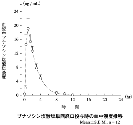 健康成人男子12名に、ブナゾシン塩酸塩として2mg(錠1mgを2錠)を食後経口投与したとき、血漿中未変化体濃度の推移は投与1時間後に最高血漿中濃度(Cmax)22.48ng/mLに達し、以後減少する。消失半減期は1.51時間であり、血漿中濃度曲線下面積(AUC)は54.68ng・hr/mLであった1) 。