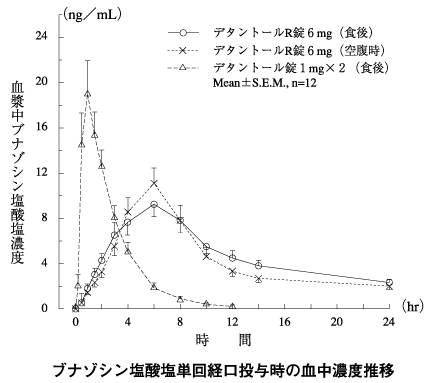 健康成人(24名)を対象にデタントールR錠3mgと同錠6mgの生物学的同等性を検討した。ブナゾシン塩酸塩として6mgを各々1回経口投与し、血漿中濃度推移を比較したところ両製剤は同等であった。