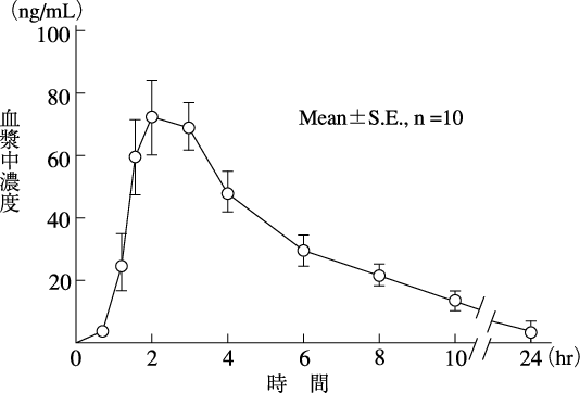 本剤2錠(ベラパミル塩酸塩として80mg)を健康成人男子10名に単回経口投与した場合、血漿中濃度は投与後2.2時間(tmax)で最高値に達し、以後比較的速やかに減少した。なお、投与後24時間までの血漿中濃度曲線下面積(AUC)は450.9ng・hr/mLであった。