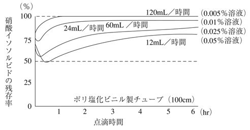 硝酸イソソルビドは、一般に使用されているポリ塩化ビニル製の輸液容器及び輸液セットに吸着するが、ガラス製、ポリエチレン製の容器、器具には吸着しない。硝酸イソソルビドのポリ塩化ビニル製輸液セットに対する吸着率は、図に示す通りで点滴速度に影響され、ポリ塩化ビニル管100cmでは点滴速度60mL/時間(1mL/分)以上であれば、投与量の80%以上が静脈内に注入される。また、硝酸イソソルビドの吸着率は配合濃度に影響されないが、輸液セットが長い程高くなるので注意すること。