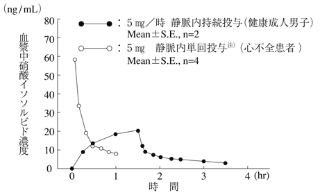 健康成人男子に硝酸イソソルビドを5mg/時で静脈内持続注入した際、硝酸イソソルビドの血漿中濃度は緩やかに上昇し、注入開始後1.5時間でほぼ定常濃度に達した。その後、注入停止とともに半減期6.3±1.0分(分布相)及び109.1±35.7分(排泄相)の2相性を示し、速やかに低下した。