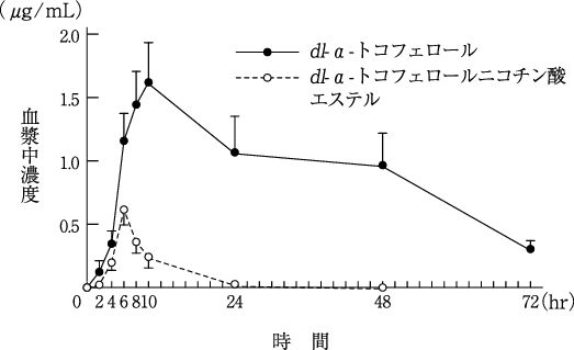 健康成人男子4名にトコフェロールニコチン酸エステルとして600注1)mgを経口投与した結果、食後服用は空腹時服用に比べ、最高血漿中濃度は32倍、AUCは29倍高い値を示した。本剤の吸収には食事が強く影響する2)。