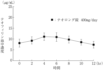 気管支喘息患者7名にテオロング錠を1回200mg、1日2回、3日以上投与した際の定常状態時での最終服薬後12時間の血中濃度を測定した。12時間の平均血中濃度(Cave)は10.16μg/mLという結果が得られ、血中濃度曲線下面積(AUC0-12)、平均滞留時間(MRT0-12)、最高血中濃度(Cmax)、最高血中濃度到達時間(tmax)については以下に示した。また、最高血中濃度(12.58μg/mL)と最低血中濃度(7.48μg/mL)はいずれも、有効域に収まることが確認された2)。