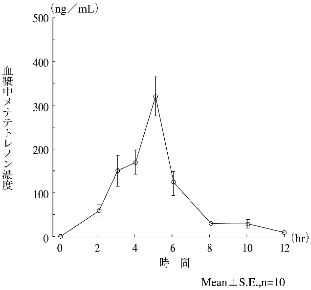 健康成人男子10名に、メナテトレノンとして30mg(6カプセル)を食後経口投与したとき、最高血漿中濃度(Cmax)は322ng/mLで、Cmaxに達する時間(tmax)は4.9時間であった。また血漿中濃度-時間曲線下面積(AUC)は1130ng・hr/mLであった。