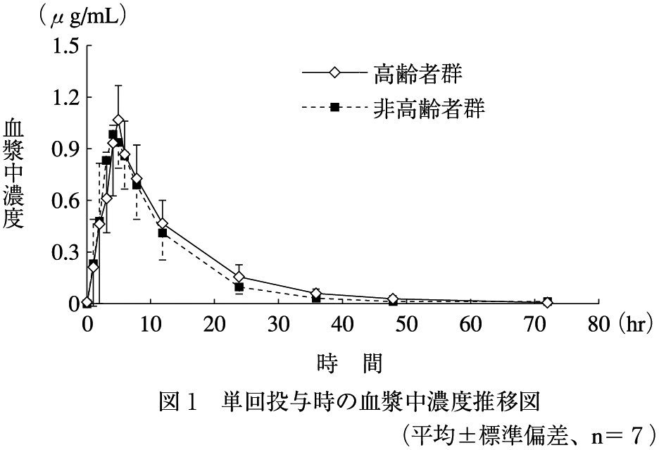 高齢及び非高齢の健康成人男子を対象に25mgを食後単回経口投与し、投与後72時間までの血漿中濃度を検討した際の濃度推移を図1に示す。血漿中濃度は投与後約4時間で最高濃度に達し、高齢者では非高齢者に比べてやや高い濃度推移を示した3) 。