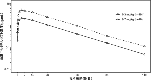 国内第Ⅰ相試験(019試験)で日本人健康被験者にソタテルセプト0.3又は0.7mg/kgを単回皮下投与した際の平均血清中濃度推移を図に、薬物動態パラメータを表1に示す。血清中のソタテルセプトは投与後4日(中央値)で最高濃度に到達し、19.2~21.5日(幾何平均)の半減期で消失した1)。