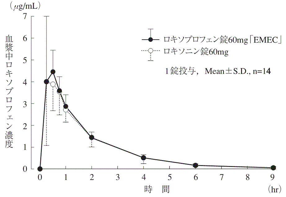 健康成人男性16例にロキソプロフェンナトリウム錠60mgを単回経口投与したところ、速やかに吸収され、血中にはロキソプロフェン(未変化体)のほか、trans-OH体(活性代謝物)の型で存在した。最高血漿中濃度に到達する時間はロキソプロフェンで約30分、trans-OH体で約50分であり、半減期はいずれも約1時間15分であった2)。