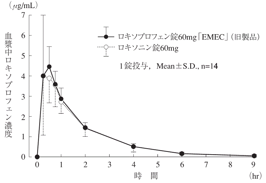 健康成人男性16例にロキソプロフェンナトリウム錠60mgを単回経口投与したところ、速やかに吸収され、血中にはロキソプロフェン(未変化体)のほか、trans-OH体(活性代謝物)の型で存在した。最高血漿中濃度に到達する時間はロキソプロフェンで約30分、trans-OH体で約50分であり、半減期はいずれも約1時間15分であった2)。