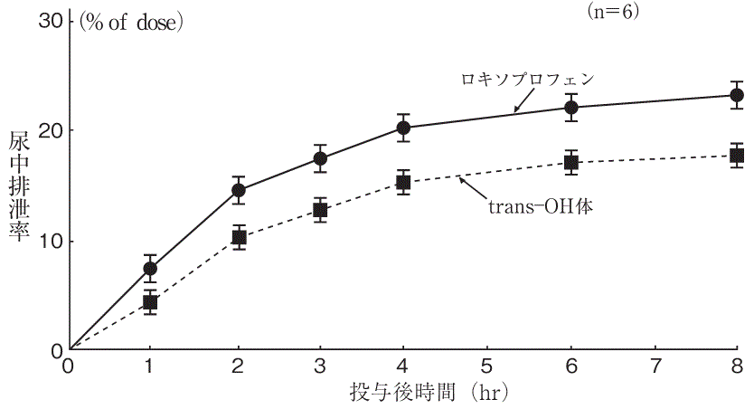 健康成人男性6例にロキソプロフェンナトリウム錠60mgを単回経口投与したとき、尿中への排泄は速やかで、尿中に排泄された大部分がロキソプロフェン又はtrans-OH体のグルクロン酸抱合体であった2)。