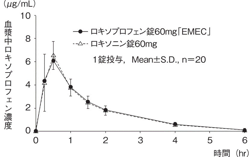 健康成人男性16例にロキソプロフェンナトリウム錠60mgを単回経口投与したところ、速やかに吸収され、血中にはロキソプロフェン(未変化体)のほか、trans-OH体(活性代謝物)の型で存在した。最高血漿中濃度に到達する時間はロキソプロフェンで約30分、trans-OH体で約50分であり、半減期はいずれも約1時間15分であった2)。
