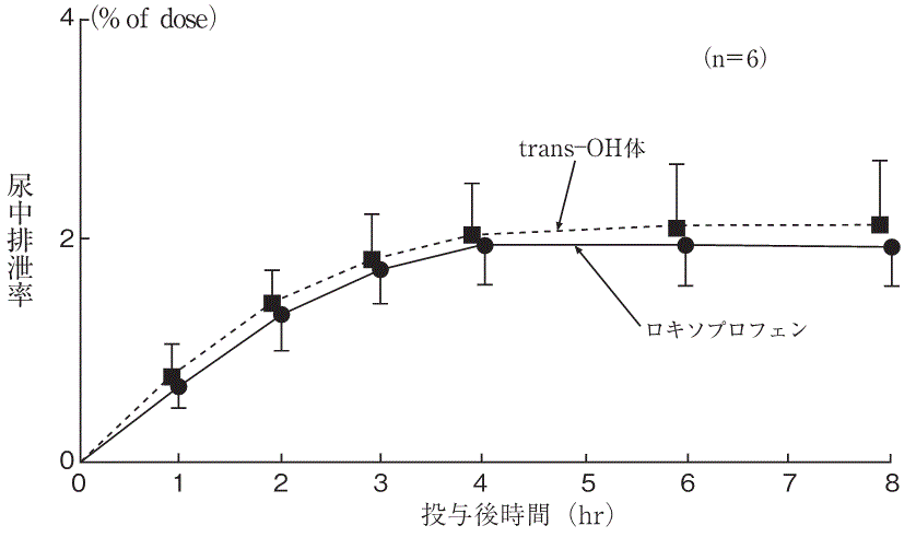 健康成人男性6例にロキソプロフェンナトリウム錠60mgを単回経口投与したとき、尿中への排泄は速やかで、尿中に排泄された大部分がロキソプロフェン又はtrans-OH体のグルクロン酸抱合体であった2)。