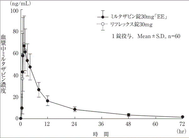 ミルタザピン錠15mg「EE」は、ミルタザピン錠30mg「EE」を標準製剤としたとき、溶出挙動が同等と判定され、生物学的に同等とみなされた21)。