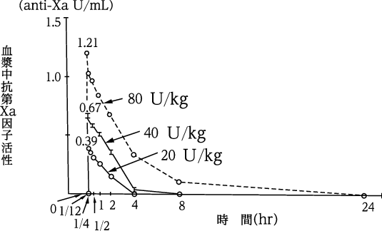 健常成人男子(17例)に本剤20単位/kg、40単位/kg、80単位/kg注1)を単回静脈内投与して得られた血漿中抗第Xa因子活性は図のとおりであり、用量相関性が認められる6)。