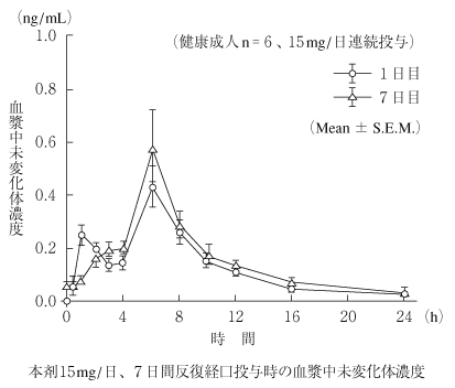 健康成人に本剤15mgを経口投与したとき、血漿中未変化体濃度は投与後約1時間及び6時間にピークを示し、消失半減期は約10時間であった。また、血漿中濃度は非直線的な増加を示した。本剤15mgを1日1回7日間連続経口投与したときの血漿中未変化体濃度は初回投与時とほとんど変わらず蓄積性はみられなかった1) 。